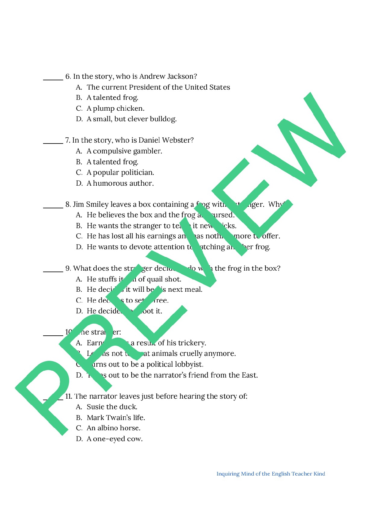 The Celebrated Jumping Frog By Mark Twain Quiz Teaching Resources
